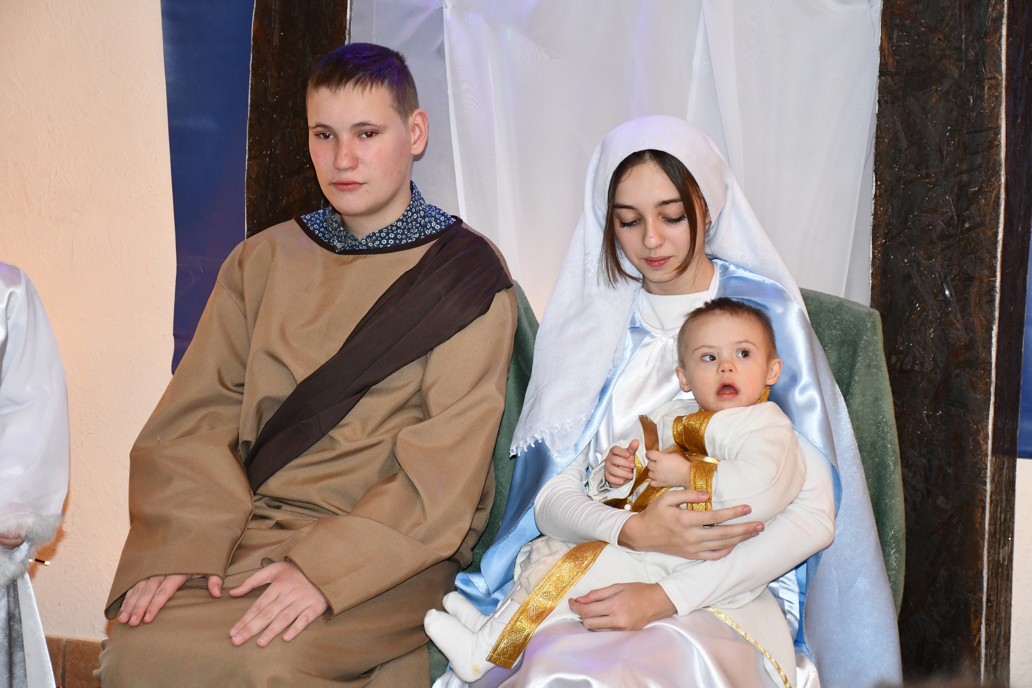 Grupa osób w kostiumach przedstawiająca scenę bożonarodzeniowych jasełek. W centralnym punkcie siedzi kobieta w biało-niebieskiej szacie, trzymająca na kolanach małe dziecko ubrane na biało. Obok nich siedzi młody mężczyzna w brązowej tunice. Przed nimi klęczą trzej mężczyźni przebrani za królów (mędrców) w bogato zdobionych szatach – złotej, czarnej oraz czerwonej. Po lewej stronie widać grupę dzieci w białych strojach z gwiazdami na opaskach, a całość dopełniają dekoracyjne, świecące drzewka w tle.